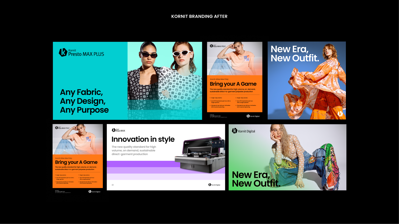 fashion and textile industry Kornit's vision is to boldly transform the world of fashion and textiles for a better, more sustainable planet. As a global leader in digital textile printing, Kornit sought to revitalize its brand with a bold and dynamic identity that reflects its innovative, future-forward approach.The design direction focused on developing a unified visual system that could seamlessly adapt across digital, print, and spatial applications, while maintaining strong brand consistency. Inspired by Kornit's proprietary “repulsion stripes” and advanced print technology, the new identity features vibrant gradients, bold typography, and striking photography of printed fabrics and garments.The result is a flexible design system applied across packaging, digital materials, presentations, space design, and even fabric prints—capturing the energy and creativity at the heart of the Kornit brand.